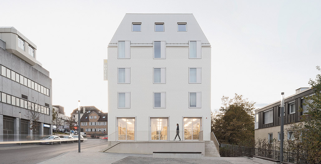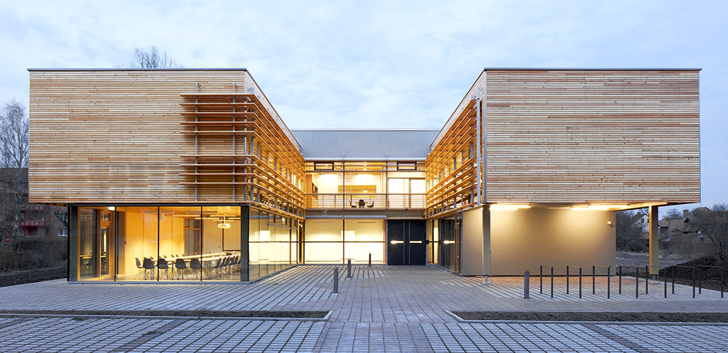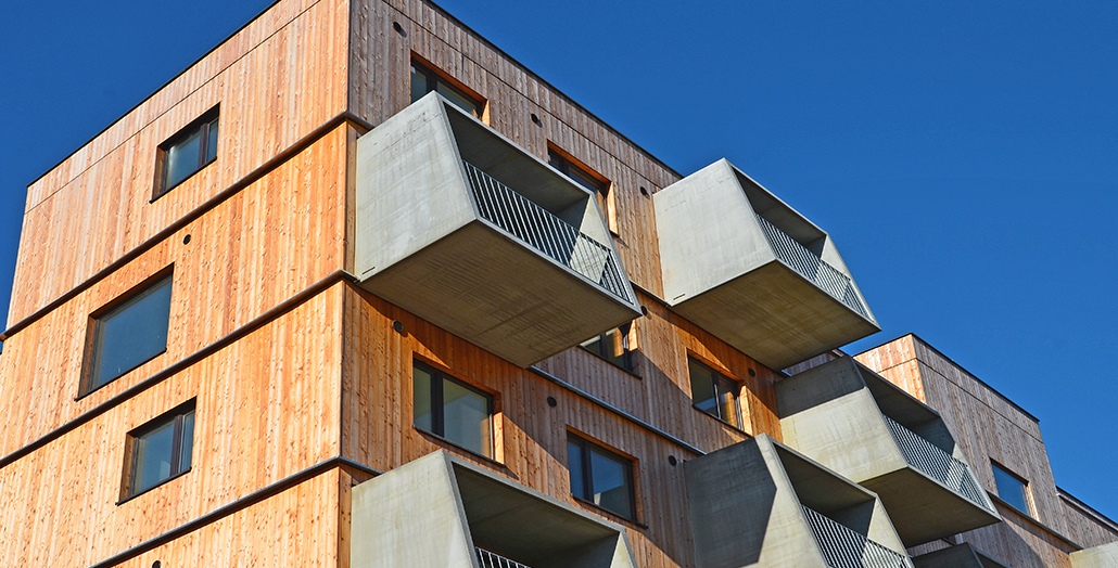 Nochmal genau hinschauen: Ja, dieses Gebäude ist tatsächlich in Holzbauweise errichtet, auch wenn die Schiefer-Fassade das auf den ersten Blick gar nicht erkennen lässt.