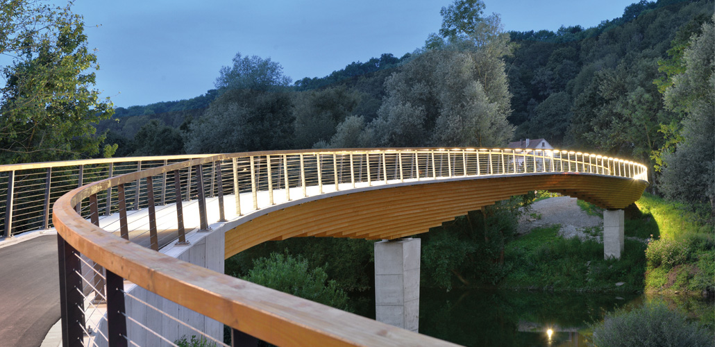 Holzbrücken in dieser Größe sind schon für sich eine Seltenheit – noch. In dieser Form aber findet man in ganz Deutschland nur eine einzige: Wie ein sanft geschwungenes S spannt sich die neue Rad- und Fußgängerbrücke von Neckartenzlingen fast 100 Meter weit und drei Meter breit über den Fluss.