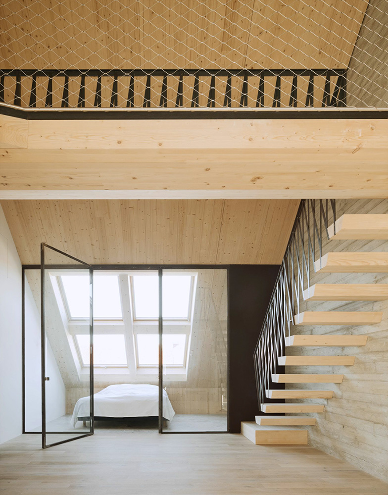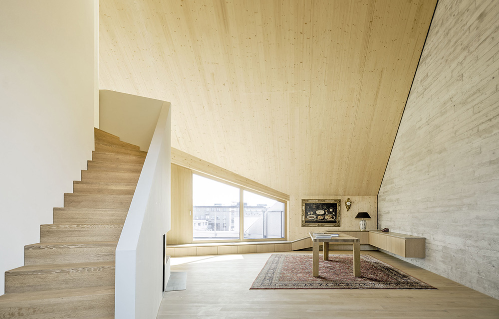 Nach der Aufstockung mit Holzbau bieten die neuen Etagen insgesamt 550 Quadratmeter Wohnfläche, die flexibel aufteilbar sind. Bis zu vier Wohneinheiten können hier ein attraktives Zuhause bieten. Derzeit sind es drei, alle extravagant geschnitten und mit viel sichtbarem Holz in den Räumen. „Die Bauherrin wollte Holz sehen“, erzählen die Architekten. Deshalb wurde auch das Interieur nach Maß aus Holz gefertigt. Das sorgt für eine behagliche, dabei urban-coole und helle Atmosphäre. Zu dieser trägt auch der Tageslichteinfall bei, der durch bodentiefe Fensterfronten und in die Schrägen integrierte Dachfenster möglich wird. Den Himmel über München sieht man von innen natürlich auch – zu jeder Tages- und Nachtzeit.