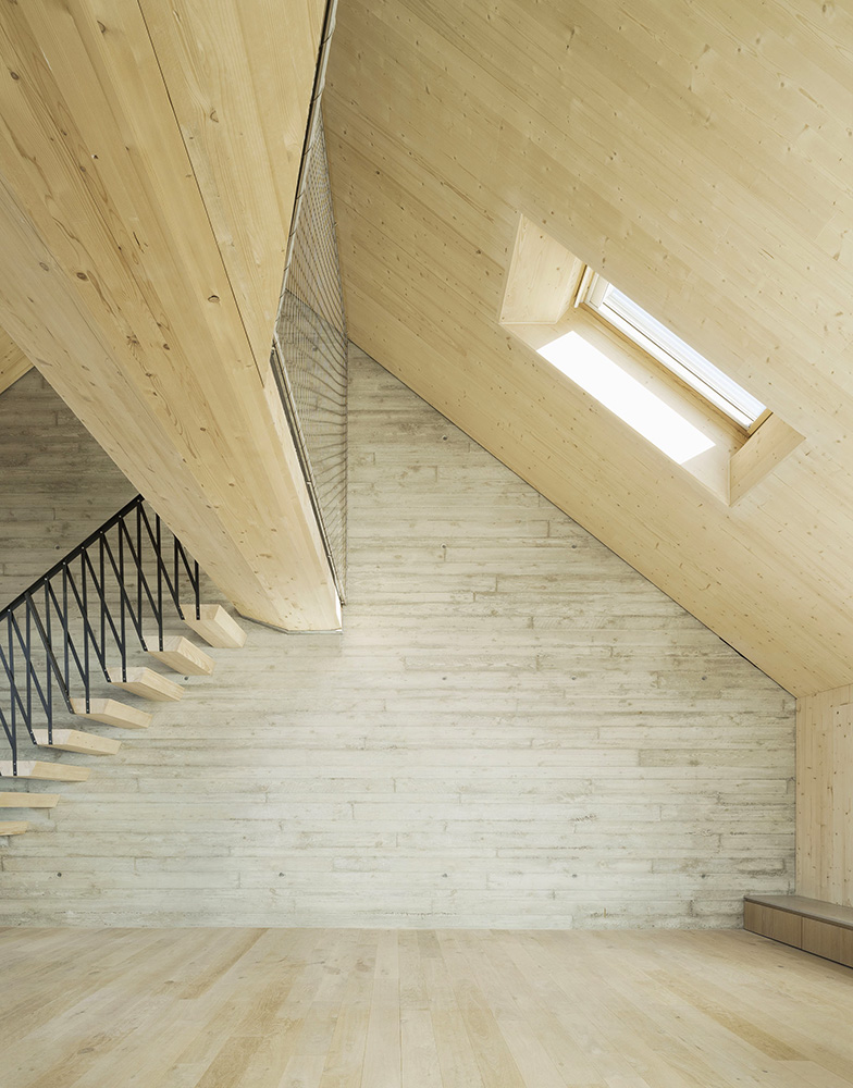 Die Konstruktion der neuen Geschosse besteht aus Brettsperrholz in gewichtsoptimierter Bauweise. „Das Fundament bot nur wenige Reserven. Holz war deshalb der einzige Baustoff, der für eine Aufstockung in Frage kam.“ erklären die Architekten Isabella Leber und Martin Pool. Außen wird der Aufbau, vor allem aus stilistischen Gründen, von einer hinterlüfteten Stahlfassade eingekleidet.