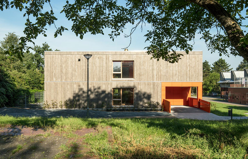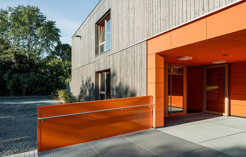Anders in Darmstadt: Hier entschied sich die Kommune bewusst für ein innovatives Konzept von mobispace als Schulhaus auf Zeit – ganz aus Holz und mit einer Atmosphäre, die Kids und Lehrer gleichermaßen vom ersten Tag an begeisterte. Mit robustem, langlebigen Lärchenholz innen und außen, mit sichtbarer Holzkonstruktion und mit großen OSB-Wandplatten aus gepressten Hobelspänen. Dafür, dass man sich zwar von Holz umgeben, aber nicht wie in einer Holzkiste fühlt, sorgt ein Designkonzept, das lebendige Orange- mit eleganten Anthrazittönen kombiniert.