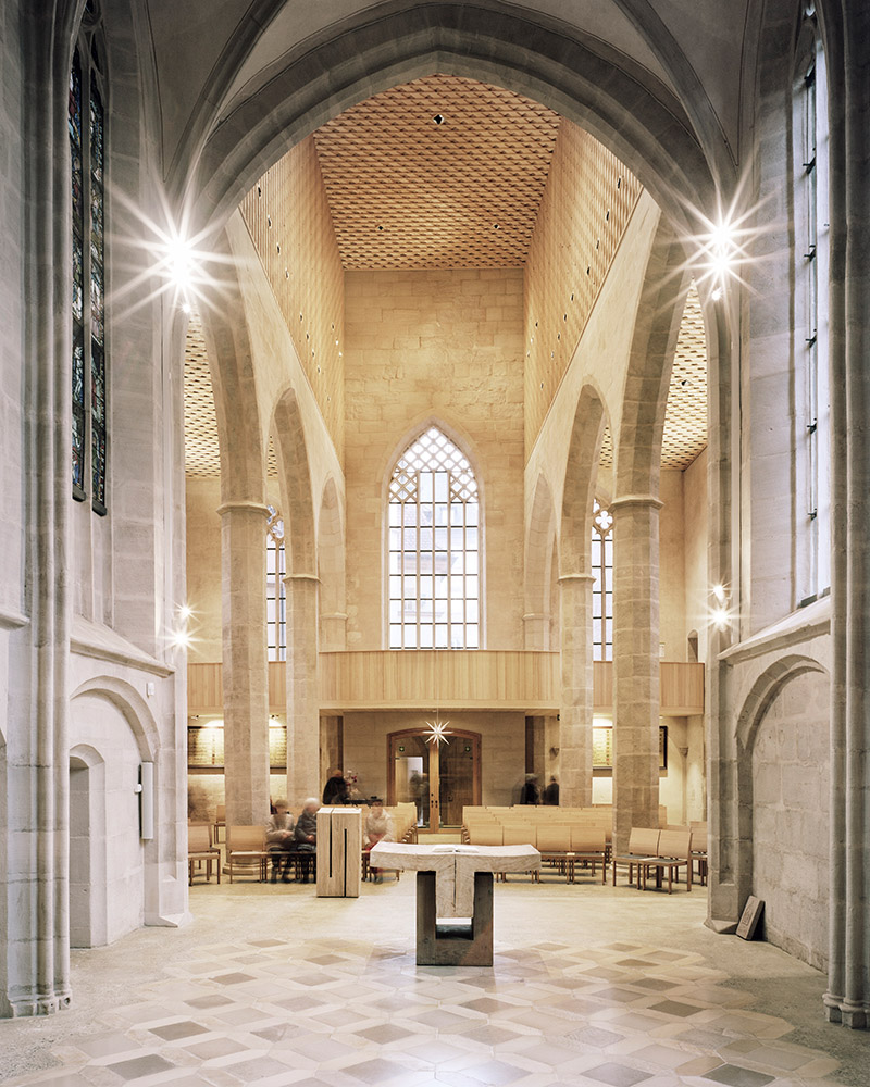 Bei Wiederaufbau wurden die noch brauchbaren Gebäudeteile harmonisch mit neuen verbunden. Vor allem im Innenraum sieht man, welch große Rolle Holz bei der Restaurierung spielte: Sandstein und Holz finden zu einer beeindruckenden Wechselwirkung zusammen. Ein feingliedriges Holzflechtwerk aus Weißtanne mit absorbierenden Flächen in den Decken- und Wandbereichen verleiht dem Kirchenraum ornamentale Kraft sowie exzellente akustische Qualitäten.