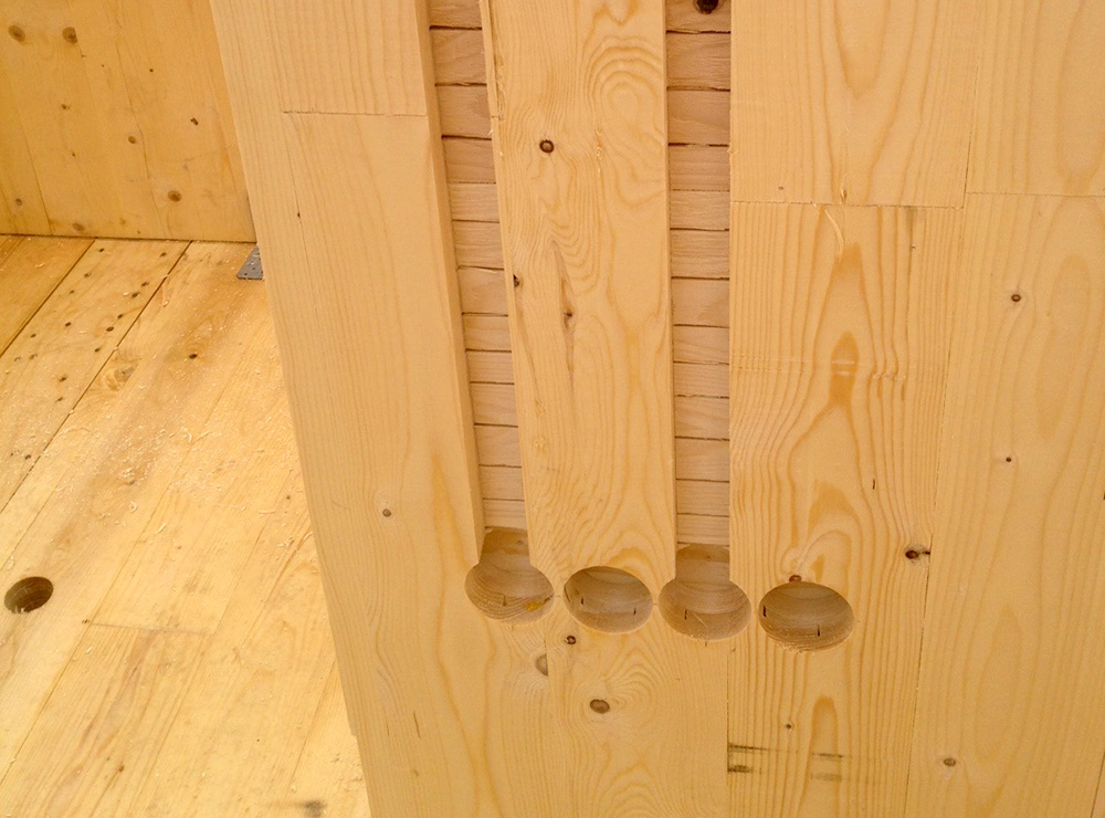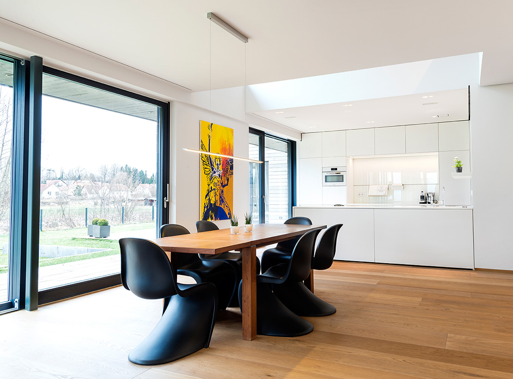 Der hohe Grad an Vorfertigung brachte mehrere weitere Vorteile mit sich: Dank der präzisen CNC-Fräsung der Wandelemente konnten die Fenster gleich mitbestellt und eingebaut werden. Das Haus war dadurch sofort dicht – anders als bei herkömmlicher Bauweise, wo die Fenster erst nach Abschluss der Rohbauarbeiten ausgemessen, bestellt und mit Verzögerung eingebaut werden können. Die vorgefrästen Elektrokanäle und Türöffnungen trugen zusätzlich dazu bei, das Gebäude schnell bewohnbar zu machen. Im Alltagsleben bieten die Holzwände klare praktische Vorteile: Eine Schraube fürs Bild oder ein Deko-Objekt beispielsweise lässt sich einfach eindrehen, ohne dass man zum Schlagbohrer greifen müsste.