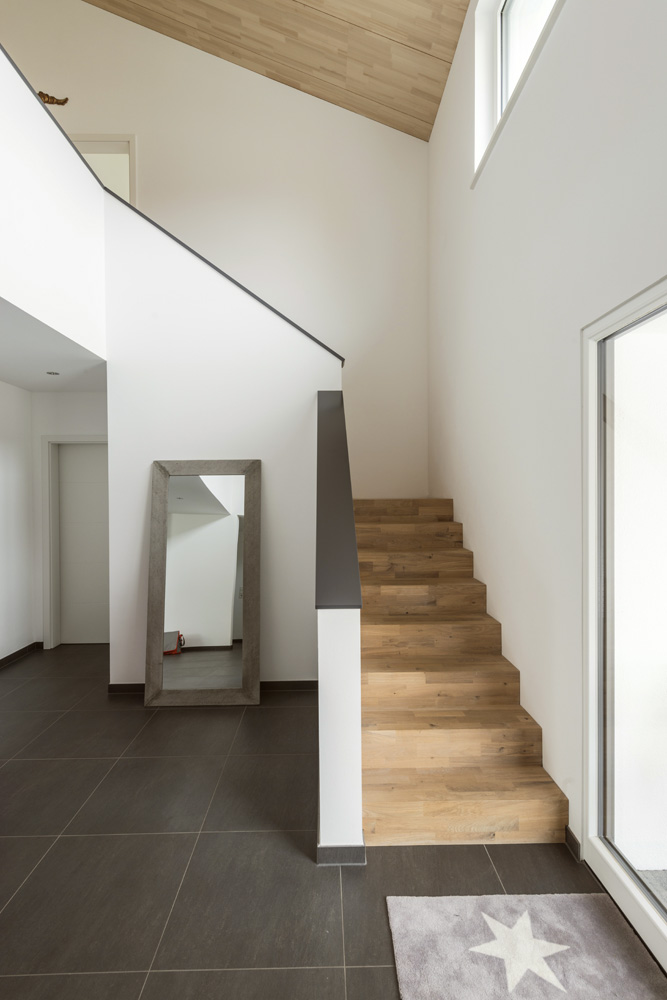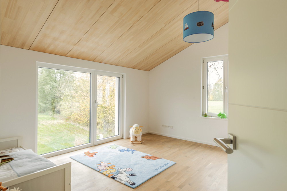 Individuell von der Architektin Katrin Moll konzipiert, vermittelt das Gebäude schon von außen einen großzügigen und freundlichen Eindruck. Tritt man ins Haus ein, so ist sein Holzcharakter zunächst kaum wahrnehmbar. Denn Wände und Decken des Erdgeschosses sind in Weiß gehalten, was viel Spielraum für Farbakzente durch Möbel und Stoffe lässt. Durch die bodentiefen Wohnzimmerfenster gelangt viel natürliches Tageslicht in die Räume. Sichtbares Holz gibt es in der Dachetage unter den Schrägen, was die Räume besonders gemütlich wirken lässt.