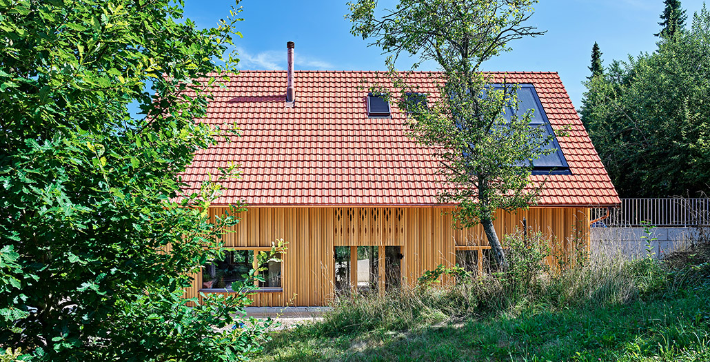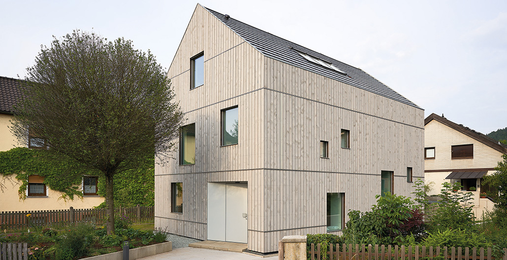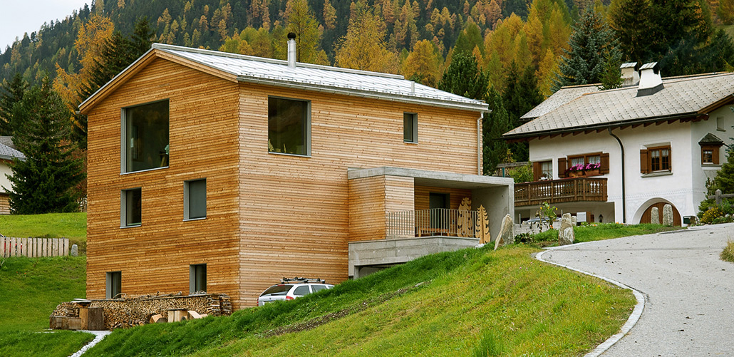 Wie sieht ein Holzhaus aus, das in einem Bergdorf komplett neu gebaut wird und zu denkmalgeschützten Höfen gleich nebenan passen soll?