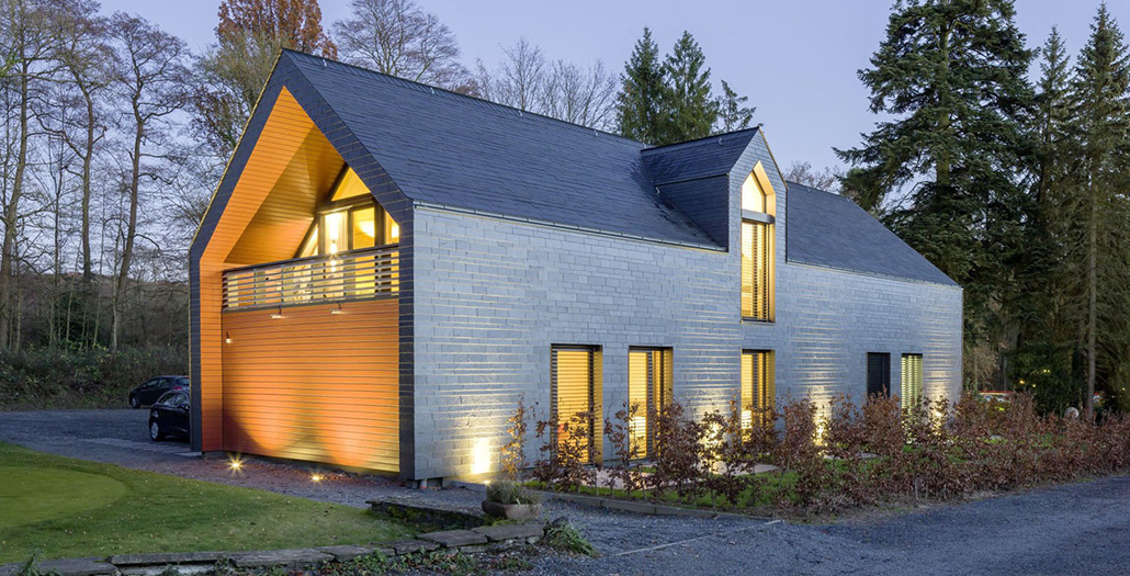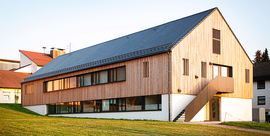 Nochmal genau hinschauen: Ja, dieses Gebäude ist tatsächlich in Holzbauweise errichtet, auch wenn die Schiefer-Fassade das auf den ersten Blick gar nicht erkennen lässt.