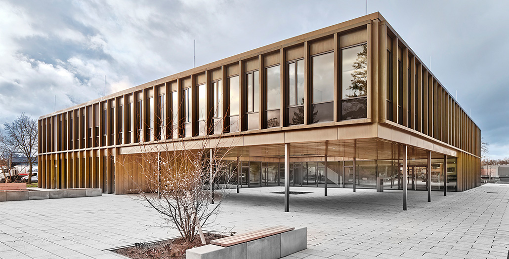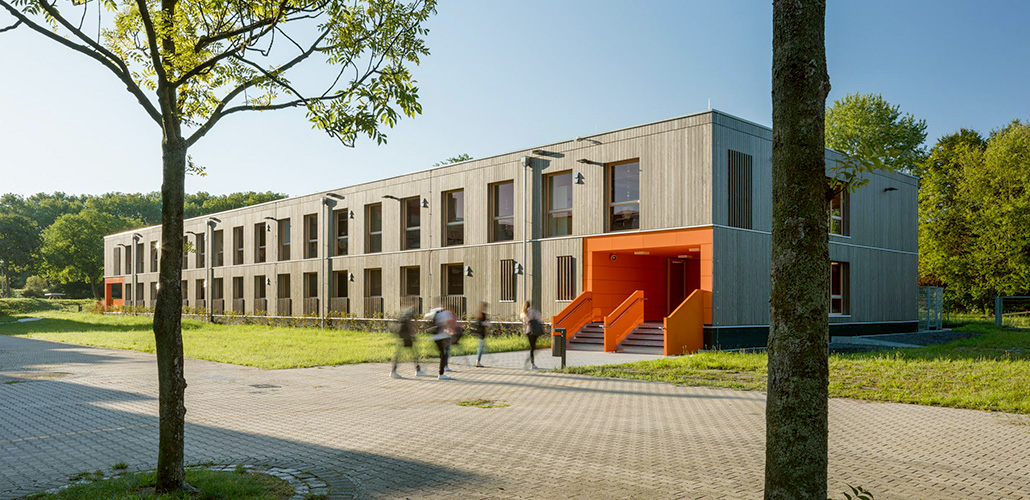 Neues Klassen-Ziel: Als Ausweichquartier während der dringend nötigen Sanierung bezog das Bertolt-Brecht-Gymnasium in Darmstadt ein modulares Gebäude aus Holz. Und das bietet so viele Qualitäten, dass die Schulgemeinschaft die Zwischenlösung nicht als „Provisorium“, sondern als attraktives Zuhause für die Schulgemeinschaft erlebt.