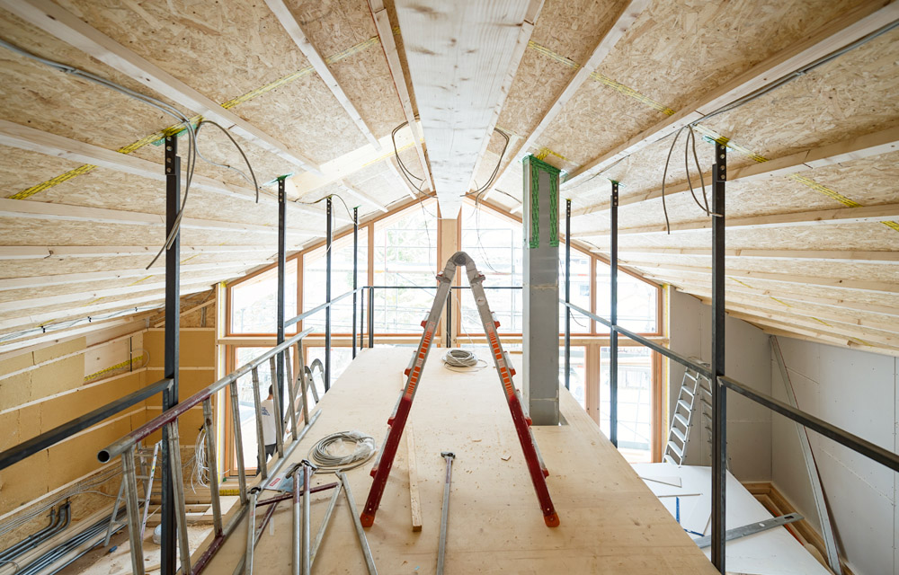 Das gelang tatsächlich: Zur Aufstockung beließ man die oberste Balkenlage des Hauses und legte dieser einfach ein Holzdeck auf, das nun den Boden der neuen Etage bildet. Danach erfolgte die eigentliche Aufbaumaßnahme: Aus präzise vorgefertigten Holzelementen entstand ein neues Dachgeschoss – und das binnen kürzester Zeit: Für den Zusammenbau einschließlich des neuen Dachstuhls benötigten die Zimmerer lediglich einen Arbeitstag. Danach folgte der Einbau der Fenster, deren besonders großzügige Dimensionen viel Tageslicht in die Räume lassen und eine positive, inspirierende Atmosphäre schaffen. Zu dieser tragen auch die Bauökologie und die Ausstrahlung des Materials Holz bei: „Wir thronen jetzt sozusagen in einem Holzhaus über dem See, mit Blick auf die alten, ebenfalls aus Holz gebauten Bootshäuser.“ freut sich Architekt Stefan Mohr über das gelungene Ergebnis – und über das gute Gefühl, das der neue Arbeitsbereich vermittelt. Alle Innenausbauten eingerechnet, war die Extra-Etage schon nach vier Monaten bezugsfertig.