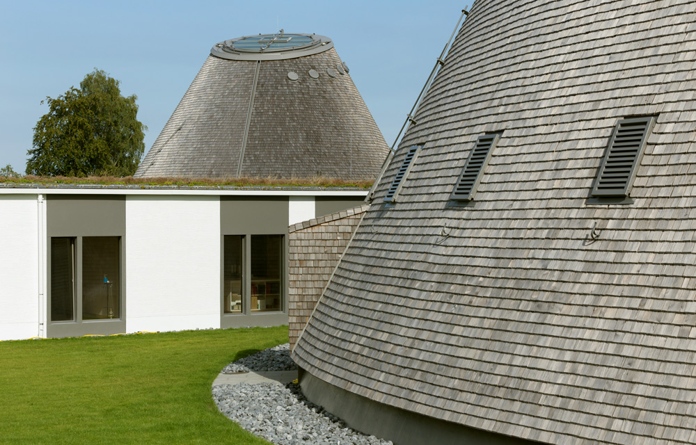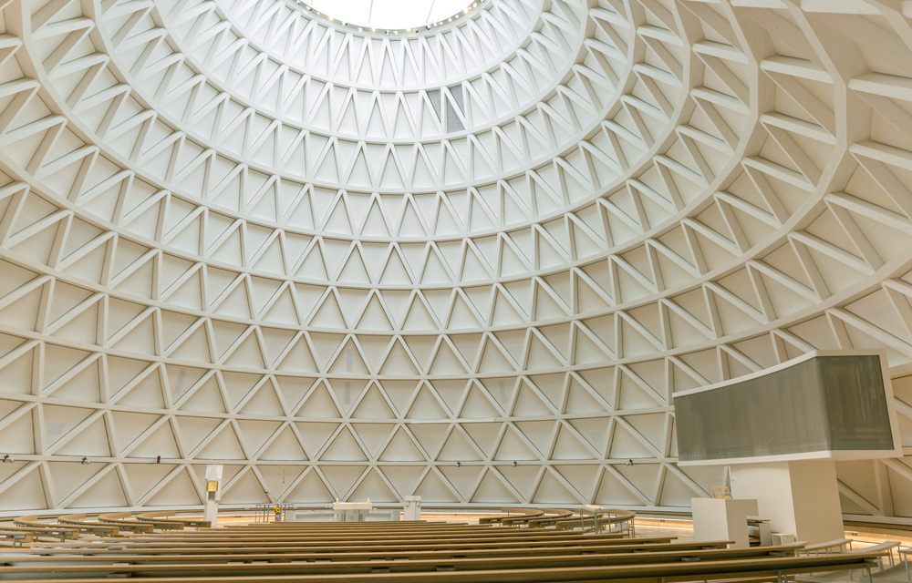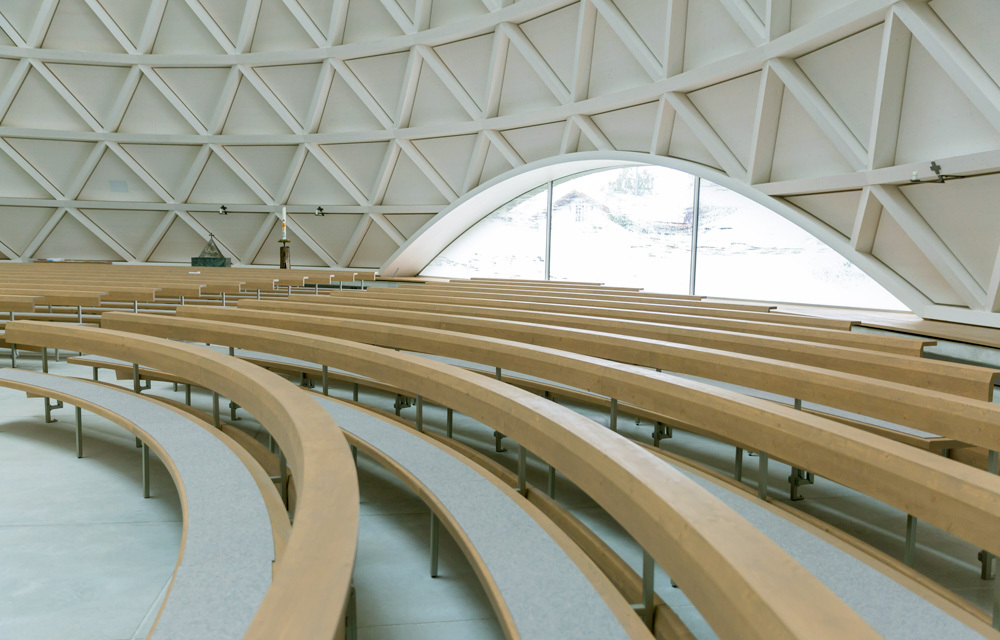 Dass der Neubau schon viele Besucher, auch von auswärts, anlockte, liegt aber nicht nur an der sensationellen Silhouette. Auch innen sorgt das verwendete Holz für ein ungewöhnliches Kirchen-Erlebnis: Es vermittelt schon beim Betreten des Rundkörpers ein Gefühl von Geborgenheit, hält die Temperaturen auf einem angenehmen Niveau – und dank eines ausgefeilten Akustikkonzepts klingen Gesang, Gebet und Orgel präzise und nachhallfrei. Für nahezu schattenlosen Lichteinfall sorgt eine große Plexiglasscheibe in der Decke.