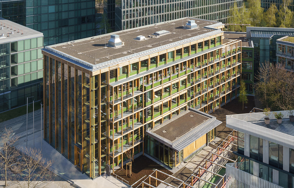 Diese Herausforderung lösten die Architekten von Element A aus München mit kreativen Konzepten, viel gestalterischem Mut – und mit dem intensiven Einsatz von Holz als Baumaterial. Das Gebäude wurde komplett entkernt und erhielt ein neues Multispace-Innenleben, das von hellem Holz geprägt ist und eine angenehme Arbeitsatmosphäre schafft. Die Platzfrage beantwortete man durch Aufstockung zweier zusätzlicher Geschosse in Holzbauweise. Das bot sich insofern als optimale Methode an, als das vorhandene Betongerüst eine massive Aufstockung gar nicht hätte tragen können. Holz hingegen liefert eine hohe Stabilität bei geringem Eigengewicht.