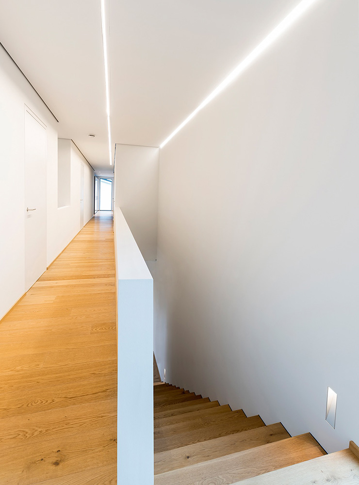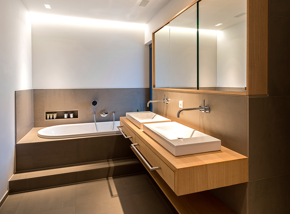Auch im Inneren des Hauses nimmt Holz eine prägende Rolle ein. Die Böden der Wohnräume bestehen aus gekalkter Eiche, und in Küche und Bad wurde Holz effektvoll als warmes Komponentenmaterial eingesetzt. All dies lässt die Räume nicht nur elegant und großzügig, sondern auch extrem behaglich wirken. Gutes Klima inklusive: Im heißen Sommer 2015 lag die Raumtemperatur bei durchschnittlich 22° C. Im Winter erzielt das Haus dank modern gedämmter Holzbauweise eine hervorragende Energieffizienz.