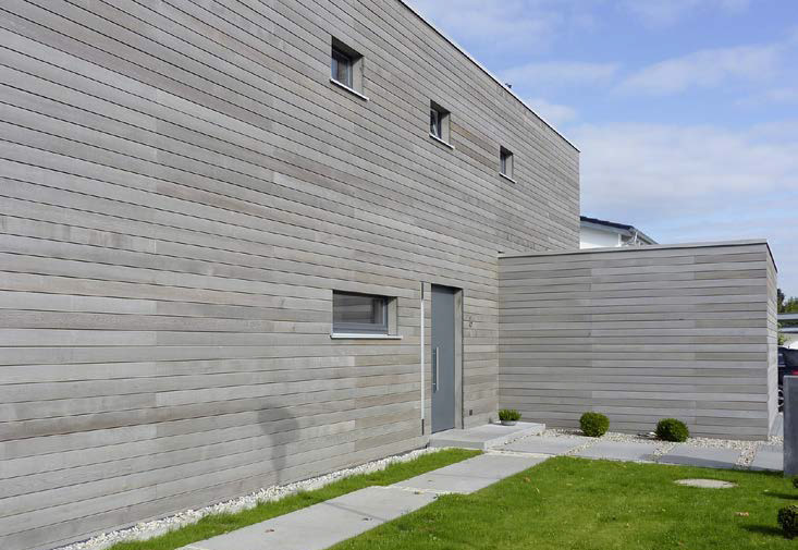 Von weitem betrachtet ist das moderne Einfamilienhaus im bayerischen Aichach nahezu unsichtbar, so gut fügt es sich in die Landschaft ein. Die schlammgraue Zedernholzschalung, die das Gebäude rundum einfasst, wirkt als natürliche Camouflage. Zur Straße hin präsentiert sich das Haus eher abgeschlossen. Auf der Seite zum Naturschutzgebietet dagegen ist es weit offen für den hinreißenden Weitblick ins Grüne, einschließlich aufschiebbarer Elemente im Erdgeschoss. „Unser Ziel war, dass das Haus die faszinierende Umgebung einlässt und erlebbar macht“, erklärt Carolin Moser von mocar architects aus Aichach, die das Gebäude entworfen und realisiert haben.
