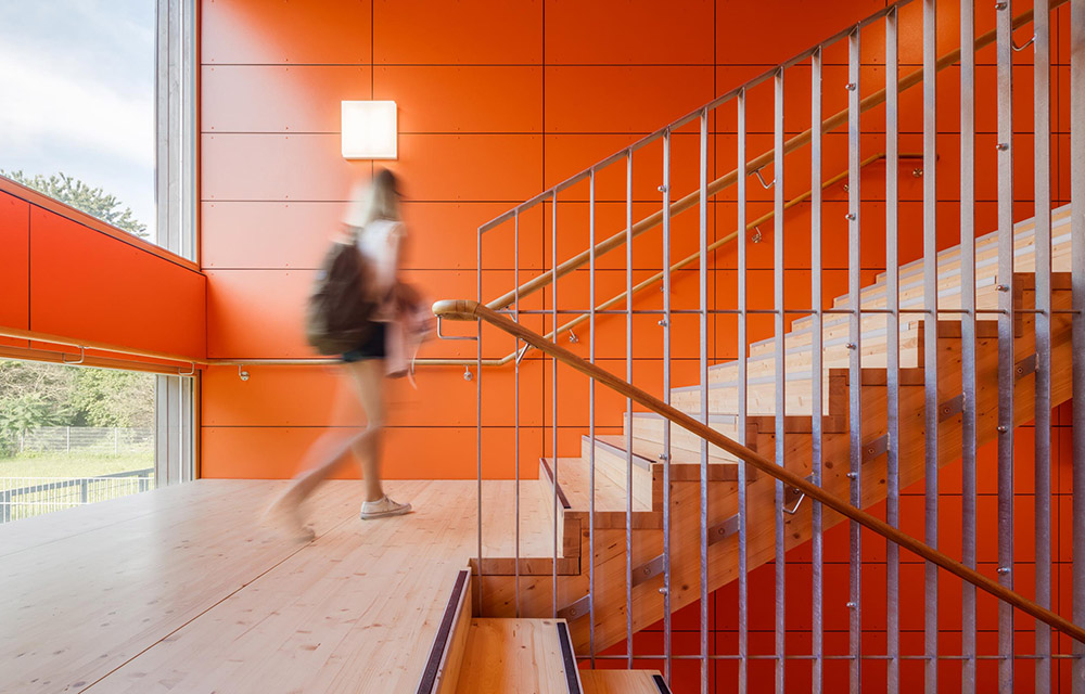 Anders in Darmstadt: Hier entschied sich die Kommune bewusst für ein innovatives Konzept von mobispace als Schulhaus auf Zeit – ganz aus Holz und mit einer Atmosphäre, die Kids und Lehrer gleichermaßen vom ersten Tag an begeisterte. Mit robustem, langlebigen Lärchenholz innen und außen, mit sichtbarer Holzkonstruktion und mit großen OSB-Wandplatten aus gepressten Hobelspänen. Dafür, dass man sich zwar von Holz umgeben, aber nicht wie in einer Holzkiste fühlt, sorgt ein Designkonzept, das lebendige Orange- mit eleganten Anthrazittönen kombiniert.