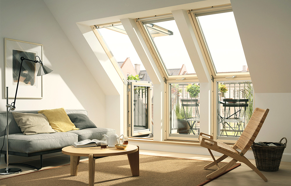 „Das Wetter ist heute so wunderbar. Ich gehe jetzt einfach mal raus an die frische Luft.“ Viel länger, als diesen Satz zu sprechen, dauert es auch nicht, einen Dachaustritt einsatzbereit zu machen – er ist mit wenigen Handgriffen ausklappbar. Ein Dachaustritt ist im Grunde nichts anderes die temporäre Version eines Dachbalkons: ein hohes, zweiflügeliges Dachfenster mit Spezialfunktionen. Der obere Teil der Scheibe kann sich nach außen und oben bis in die Horizontale neigen, der untere Teil lässt sich senkrecht wie eine kleine Wand aufstellen. Seitlich klappt sich beim Öffnen automatisch ein sicherndes Geländer aus – schon ist der Minibalkon fertig zum Betreten. Als Boden des Dachaustritts dient der niedrige Raum unter der Dachschräge, der sonst ohnehin nahezu nicht nutzbar ist. Eine charmante Lösung, die in den meisten Fällen sogar genehmigungsfrei ist, da es sich bautechnisch gesehen um ein Dachfenster und nicht um eine konstruktive Veränderung des Gebäudes handelt.