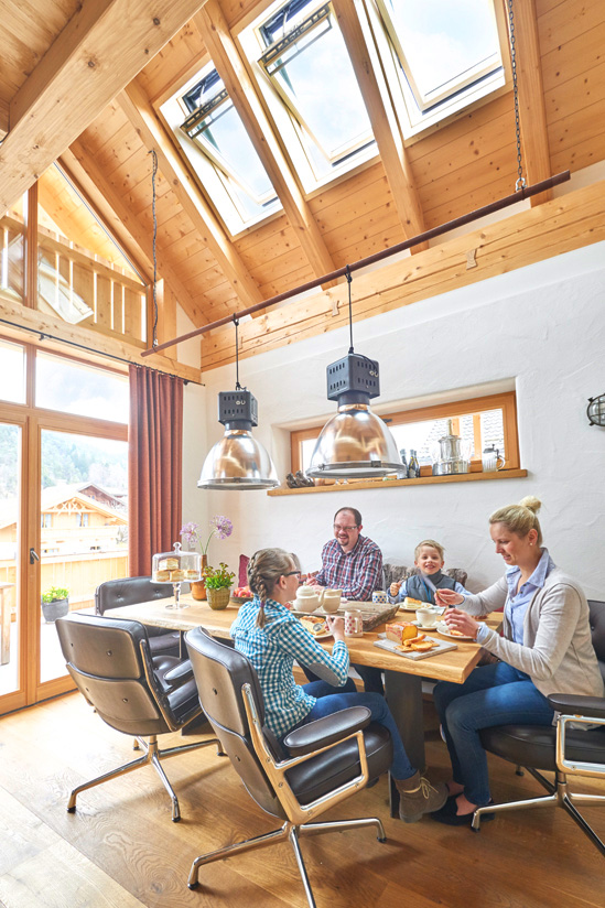 Insgesamt sechs elektrisch betriebene Dachflächenfenster sorgen für optimalen Lichteinfall zu jeder Tageszeit. Der Clou dabei: Die Fenster liegen einander paarweise hoch im Dachstuhl gegenüber – das ermöglicht eine besonders gute Querlüftung. Dadurch bleibt das Klima im Dachgeschoss selbst bei höheren Sommertemperaturen stets angenehm. „Das Spiel von Licht und Schatten und die frische Luft sind jeden Tag aufs Neue ein wirklicher Genuss“, erklärt die stolze Besitzerin Frau Gruber voller Begeisterung. Sie und ihre Familie fühlen sich im renovierten Bauernhof rundum wohl – und ihre Feriengäste auch.