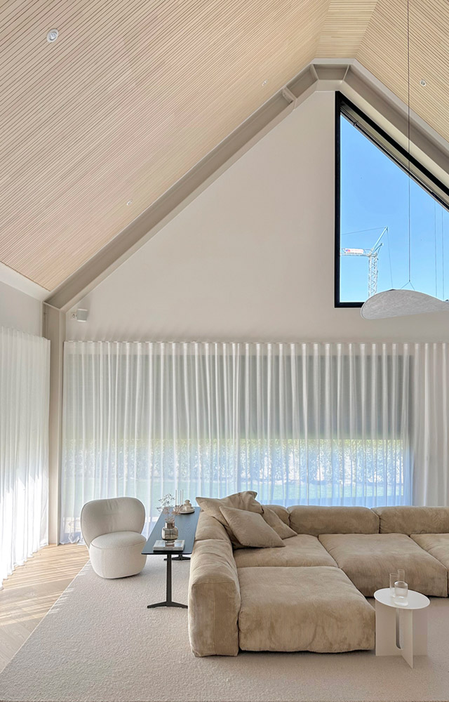 Dabei entstand ein architektonisches Gesamtkunstwerk: Die Decken des Anbaus sind so hoch konzipiert, dass sie bis zum Dachfirst reichen, was ein Gefühl von Freiheit und Weite vermittelt. Dazu passen die großen Fenster, die viel Tageslicht in alle Räume fluten lassen. Für eine angenehme Wohnatmosphäre sorgen die modernen schallabsorbierenden Akustikpaneele aus Weißtanne, deren warme Oberflächen im Kontrast zu den weißen Wänden besonders edel und elegant wirken.