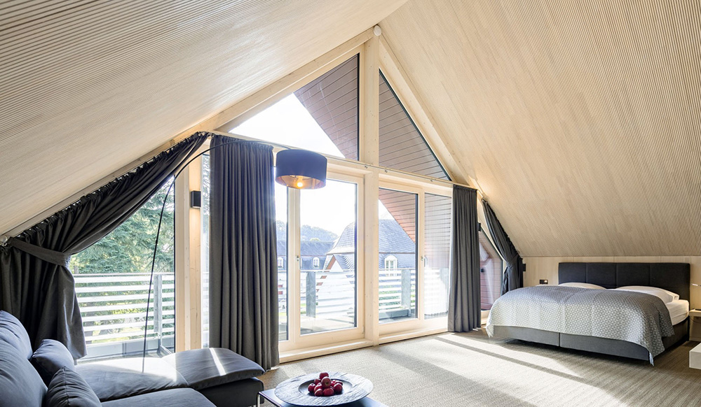 Die neue Golf-Lodge des Hotels Auel liegt mitten im Grünen, umgeben von einem mehrere Hektar großen Schloss- und Golfareal. So war es auch eine ganz natürliche Entscheidung, bei der Konzeption auf ökologische Materialien zu setzen – insbesondere auf den Baustoff Holz. Das Massivholz-Gebäude mit seinen 5 Doppelzimmern und zwei Suiten, geplant von Oxen Architekten aus Köln, bietet ein in vielerlei Hinsicht perfekt durchdachtes und realisiertes Wohlfühl-Ambiente: mit angenehmem Raumklima, hervorragendem Schallschutz und dank lückenloser Dämmung einer vorbildlichen Energiebilanz.