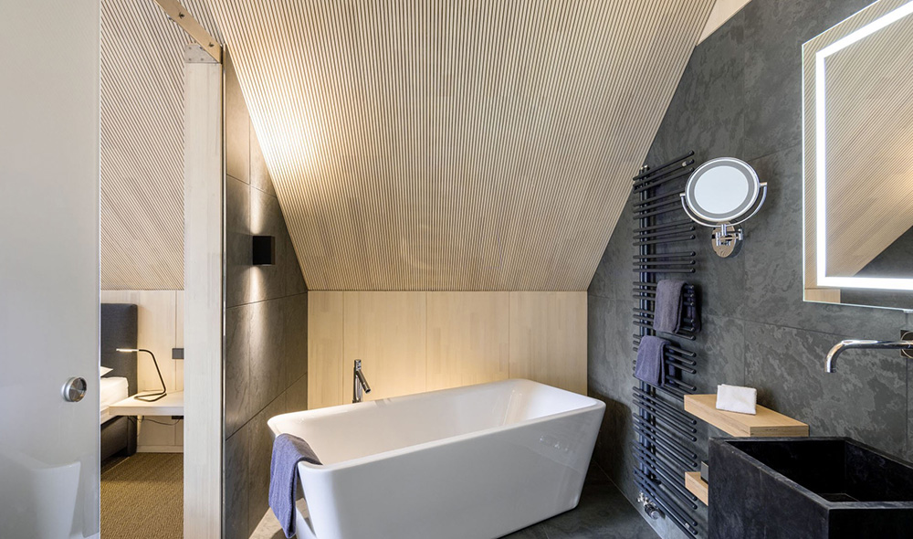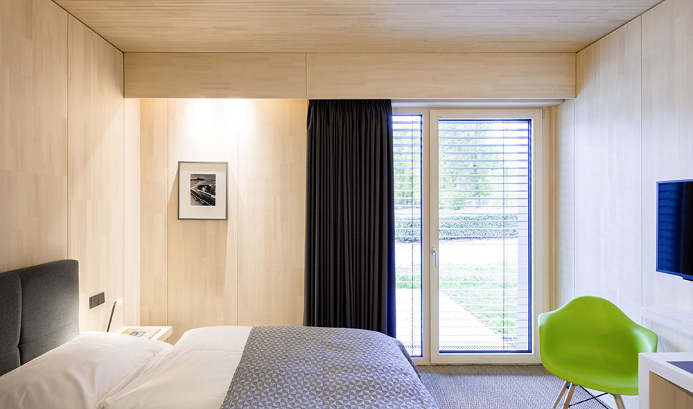 Wer sich in einer exklusiven Hotel-Lodge einbucht, stellt auch an den Schallschutz hohe Ansprüche – denn dieser gehört einfach zum perfekten Aufenthaltserlebnis. Dafür sorgen die vorgefertigten und vor Ort zusammengebauten Brettsperrholzelemente. Diese bilden sozusagen ein All-in-One-Paket: Sie verbinden hochsolide statische Eigenschaften und Formstabilität mit effektiver Schallschutzdämmung. Die Raumakustik wird zusätzlich durch in Decke und Boden unsichtbar integrierte Schallabsorber und eine trittschalldämmende Kalkschüttung in den Hohlräumen perfektioniert. Man hat es also nicht nur richtig schön, sondern auch schön ruhig.