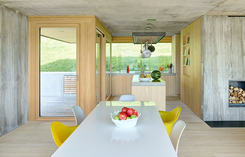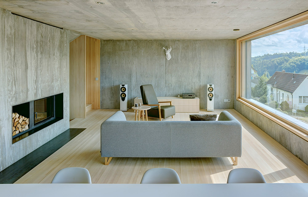 Die Lösung: Das Haus wurde teilweise in den Hang eingegraben, so dass der Sockel und das erste Obergeschoss teilweise innerhalb des Erdreichs liegen. Das Satteldach hingegen ist asymmetrisch gestaltet und passt sich so perfekt der aufsteigenden Topographie an. Ins Haus gelangt man durch einen Zugang auf der Garagenebene an der Straße – nach oben führt ein Tunnel mit Treppe.