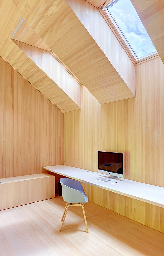 Die Fassaden-Einkleidung des Holzriegelbaus erfolgte mit Schindeln aus unbehandelter Weißtanne, was hervorragend zum ursprünglichen Charakter der Umgebung passt. Auch im Inneren entschied man sich für diese Holzart, die aufgrund ihrer hellen Farbe eine freundliche Wirkung in die Räume bringt. Auf dem geneigten Dach liegen ebenfalls dekorative Schindeln, diese bestehen aus Zedernholz. Bauteile mit Erdkontakt sind mit Beton ausgeführt.