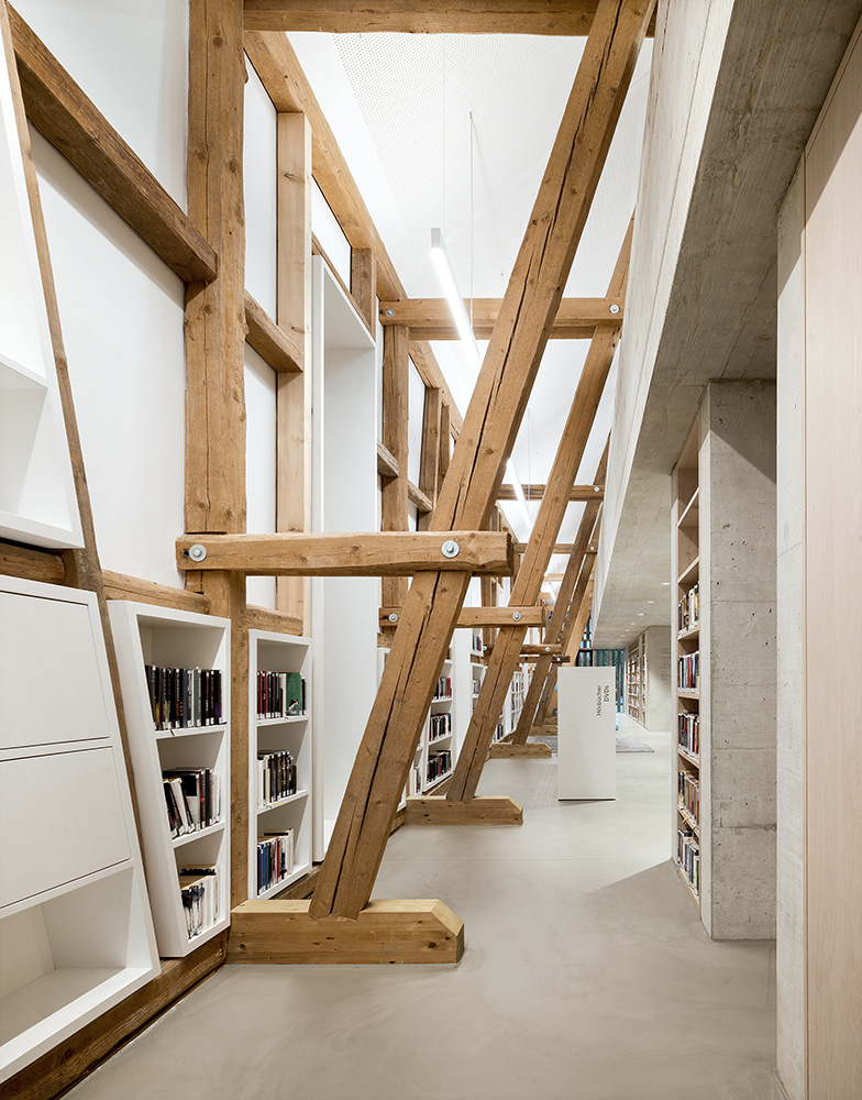 Vorrangiges Ziel der Planer war es, den ursprünglichen Charakter der Scheune zu bewahren und sie gleichzeitig in einen modernen Funktionsbau zu verwandeln. Der einstige Steinsockel, jetzt aus Beton, und das weit auskragende Satteldach künden noch deutlich von der ehemaligen Nutzung. Auch innen wurde die althergebrachte Struktur beibehalten: Das Erdgeschoss bildet eine massiv wirkende Basis mit stattlichen 70 cm Wandstärke, darüber erhebt sich eine luftige, hohe Tenne mit frei liegendem Dachstuhl. Wie viel Handwerkskunst und Kreativität in die Restaurierung investiert wurde, zeigt ein Blick auf die Details: Das alte Holztragwerk des Daches wurde abgetragen, Stück für Stück instandgesetzt und wieder zusammengebaut. Sogar der Effekt der scheunentypischen Holzlattung, helles Sonnenlicht, das durch Ritzen scheint, wurde gestalterisch neu erschaffen. Schlanke Holzlamellen vor den Fenstern lassen natürliches Licht in die Räume einfallen und brechen es so, dass es beim Schmökern nicht stört. Für die anspruchsvollen Holzarbeiten setzten die Planer auf Fachbetriebe aus der Region. Architekt Thomas Steimle erklärt, warum: „Hier am Bodensee war das verhältnismäßig einfach – gerade was die Holzarbeiten angeht. Durch die Seenähe wird Holz hier ganz anders beansprucht, und man weiß, wie mit dem Material richtig umgegangen werden muss. Es gibt noch so etwas wie Handwerkerehre, und viele Firmen wollen einfach auch aus Prinzip Qualität bauen.“