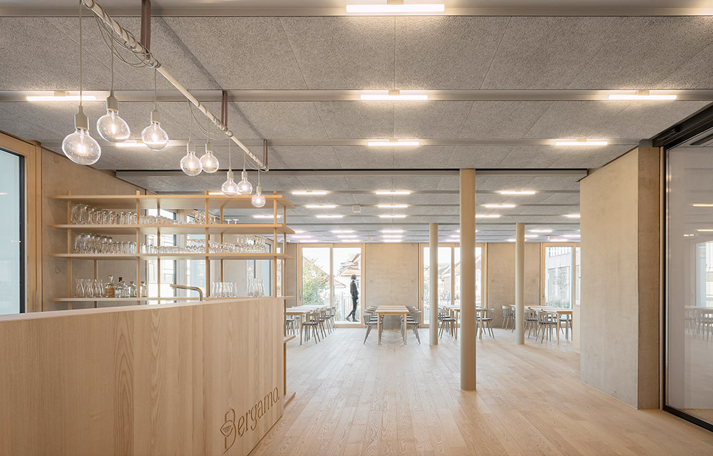 Ein ganz besonderer Vorteil von Holz kam ebenfalls zum Tragen: Aufgrund des hohen Vorfertigungsgrades konnten die Bauarbeiten während des laufenden Schulbetriebs durchgeführt werden. Wichtig für ein Schulgebäude ist natürlich auch der Brandschutz. In diesem Punkt erreichen die Holzbau-Erweiterungen problemlos den gleichen Wert wie der massive Bestandsbau – auch die Aula für 1.200 Personen entspricht den Brandschutzanforderungen.