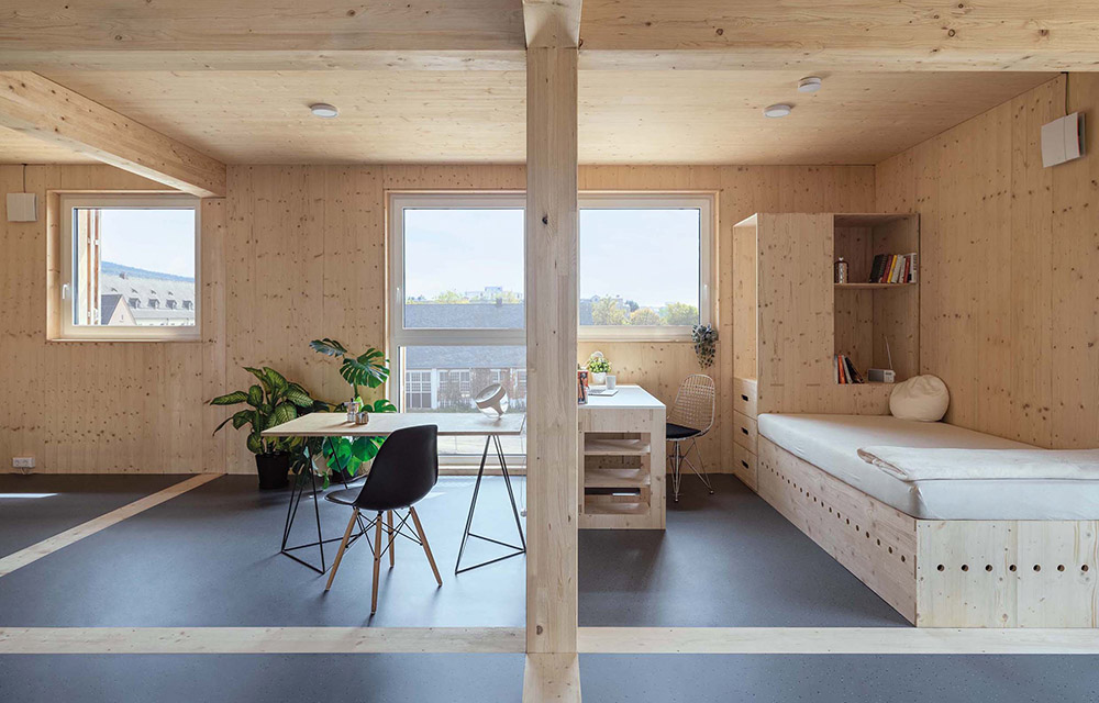 Der innovative Holzbau besteht aus zwei Baukörpern mit je vier Geschossen. In diesen finden 46 Wohngemeinschaften mit je 3 bis 4 Personen Raum zum Leben, Lernen und auch für Interaktion. Jede WG hat etwa 80 m² zur Verfügung. Die einzelnen Zimmer bieten standardmäßig 14 m² Wohnfläche, können aber variabel bis auf 7 m² verkleinert werden. Der Clou sind bewegliche Holz-Wandelemente: Entscheidet sich eine Wohngemeinschaft für weniger Privat- zugunsten von mehr Gemeinschaftsfläche, lässt sich problemlos und schnell ein größerer Extra-Raum schaffen – bei Bauten wie diesen eine fast revolutionäre Flexibilität, die dank Holzbau erst möglich wurde.
