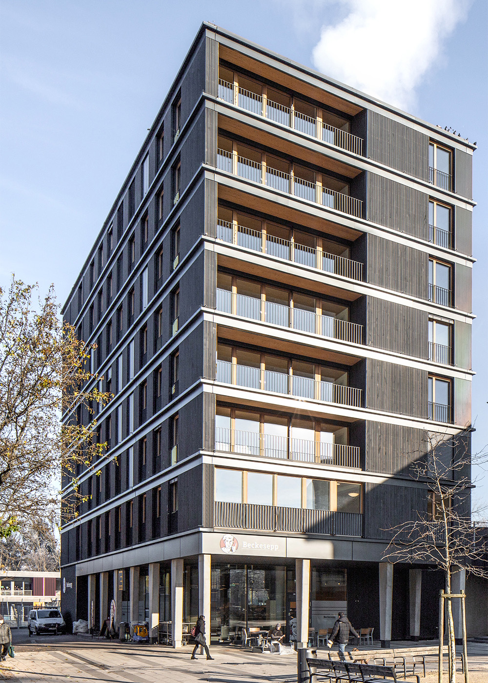 Im Freiburger Stadtteil Weingarten zeigt das Wohn-und Geschäftshaus Buggi 52, wie attraktiv urbane Nachverdichtung aussehen kann und welche Möglichkeiten moderner Holzbau dafür bietet. Die Obergeschosse 1 bis 7 wurden vollständig in Holzbauweise errichtet, einschließlich der Treppenhäuser und des Aufzugsschachts – bislang einmalig in der höchsten Gebäudeklasse 5 und ein guter Beweis dafür, dass Holzbauweisen auch im Brandschutz punkten können. Zudem ist Buggi 52 der erste Holzbau in Deutschland mit einer FSC-Zertifizierung: Das Holz stammt aus heimischem Anbau.