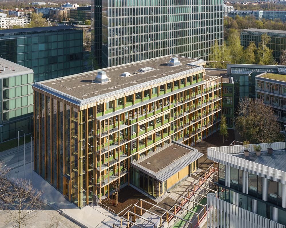 Das Überraschende an diesem preisgekrönten Objekt: Es ist kein Neubau. Der Kern der Bundesgeschäftsstelle des Deutschen Alpenvereins stammt aus den 1970er Jahren. Statt Abriss entschied man sich für ein Upgrade mit Holz – eine Aufstockung um zwei Geschosse und eine innovative Fassadengestaltung, die auch die Lüftung übernimmt, und das rein durchs Design ohne zusätzliche mechanische Elemente. Die Aufstockung selbst war nur mit Holz möglich, da sein geringes Eigengewicht der vorhandenen Gebäudestatik gerecht wird.