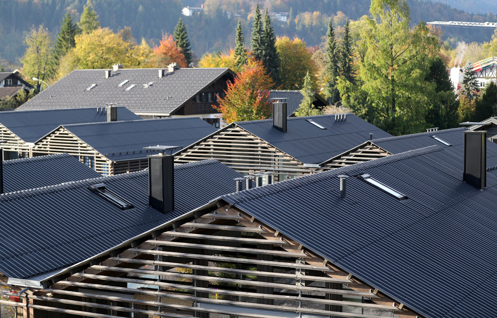 Eine sichtbare Referenz an die klassische alpenländische Architektur ist die Holzbauweise der Gebäude. Sie lässt das Quartier als Ganzes behaglich wirken, demonstriert aber in ihrer innovativen Formgebung, dass mit Holz auch äußerst spannende bauliche Akzente gesetzt werden können. Reichlich Front- und großzügig dimensionierte Dachfenster lassen Licht in die Räume – und den Blick frei ins Grüne schweifen.